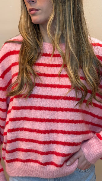 Pull Acelia en maille douce et moelleuse, décliné dans des harmonies de roses sublimées par des rayures contrastées rouges ou orange qui apportent caractère et modernité. Sa coupe légèrement ample et ses finitions côtelées offrent un tombé confortable et féminin, idéal pour un look casual lumineux, chaleureux et plein de pep’s.